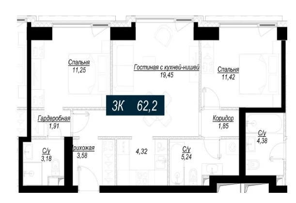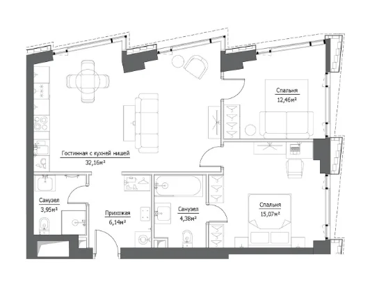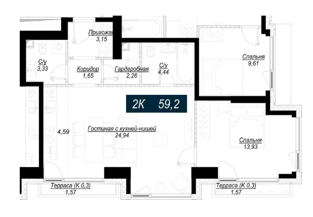 - 2 комнаты от 61м2