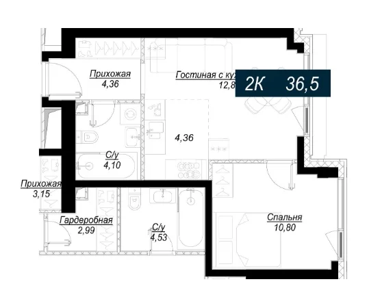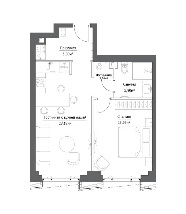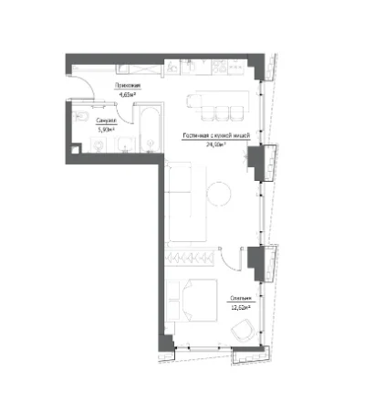- 1 комната от 38 м2