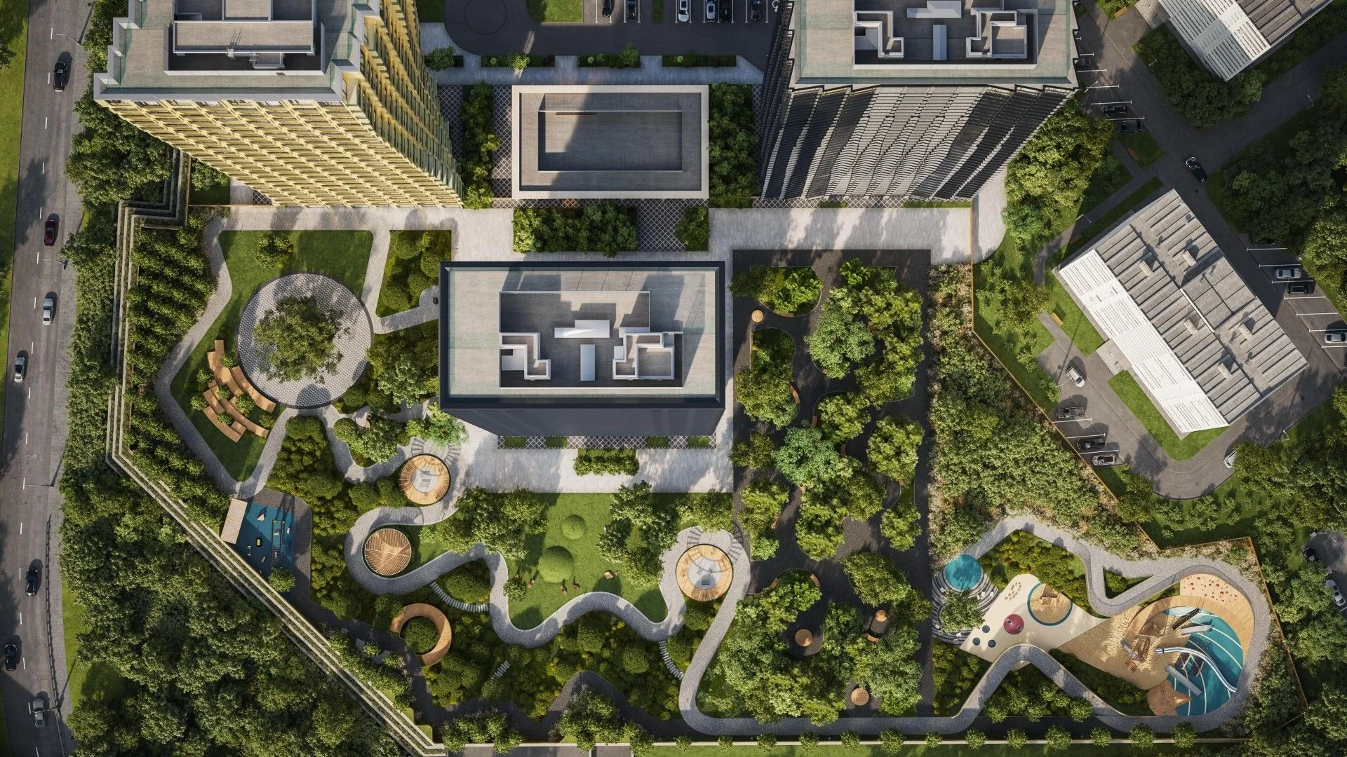 Территория комплекса разделена на функциональные зоны для различных видов деятельности, что позволит каждому жильцу найти занятие по душе, не мешая остальным. Для детей предусмотрены разнообразные игровые площадки с песочницами, качелями, горками, батутами и т.д. Взрослые смогут заниматься спортом или йогой во дворе. Также будет доступна зона для спокойного отдыха на террасе с местами для пикника. От ЖК к Сетуньскому лесопарку проложены пешеходные и велосипедные дорожки. В подземной парковке на двух уровнях могут разместиться 634 автомобиля и 21 мототранспортное средство. Парковка будет оборудована зарядными устройствами для электромобилей и системой подкачки шин. Кроме того, здесь будут доступны тележки для разгрузки автомобилей. Также в келлерах на территории паркинга можно будет хранить крупногабаритные и сезонные предметы.